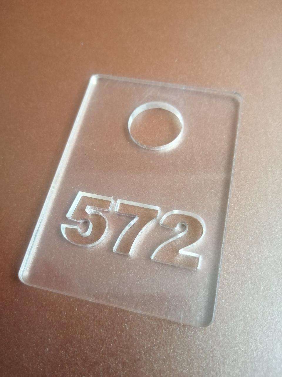 Номерки изготавливаются из прозрачного, цветного прозрачного и цветного не прозрачного оргстекла. Графика наносится методом лазерной гравировки. Возможно нанесение цветной графики - шелкографией, УФ-печатью или аппликацией пленки.